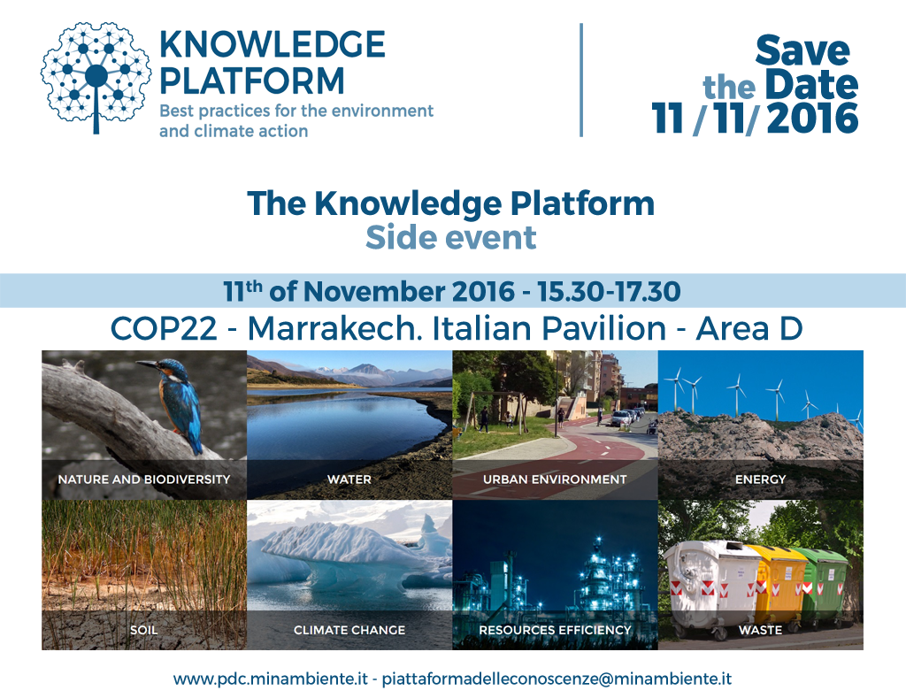7 Novembre - Un appuntamento di respiro internazionale per la Piattaforma delle Conoscenze che sarà presente a Marrakech nell’ambito dei side events organizzati dal Ministero dell’Ambiente in occasione della ventiduesima Conferenza mondiale sul clima, la COP22, prevista nei giorni dal 7 al 18 novembre 2016.