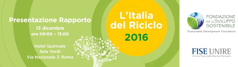 2 Dicembre - Presentazione del Rapporto settima edizione del report annuale sul riciclo ed il recupero dei rifiuti, realizzato dalla Fondazione per lo Sviluppo Sostenibile e FISE UNIRE, con il patrocinio del Ministero dell'Ambiente, del Ministero dello Sviluppo Economico e dell'ISPRA. Un incontro particolarmente significativo perché si inserisce nel contesto del Pacchetto sull’economia circolare, presentato dalla Commissione europea con le opportunità rappresentate dagli ambiziosi target di riciclo proposti nel Pacchetto.